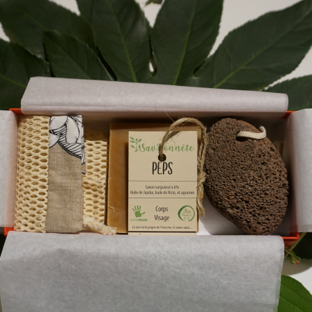 contenant 1 savon bio rectangulaire de 100g à choisir, une pierre ponce en pierre de lave, et un filet "fin de savons" pour ne pas en perdre une miette !